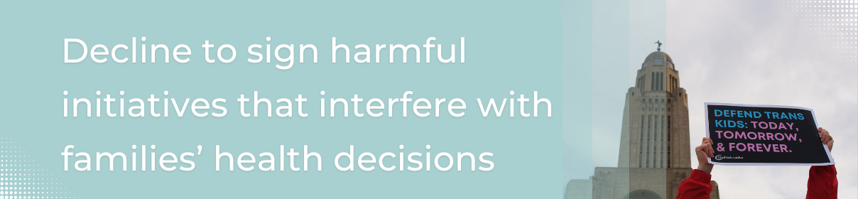 Every single Nebraskan deserves freedom, dignity, and safety. A ballot initiative named “Fairness for Girls” attempts to strip important, personal decisions away from parents, schools, and medical professionals and hand them over to politicians in order to ban transgender students from participating in school sports. This kind of government overreach does not make families safer or stronger.